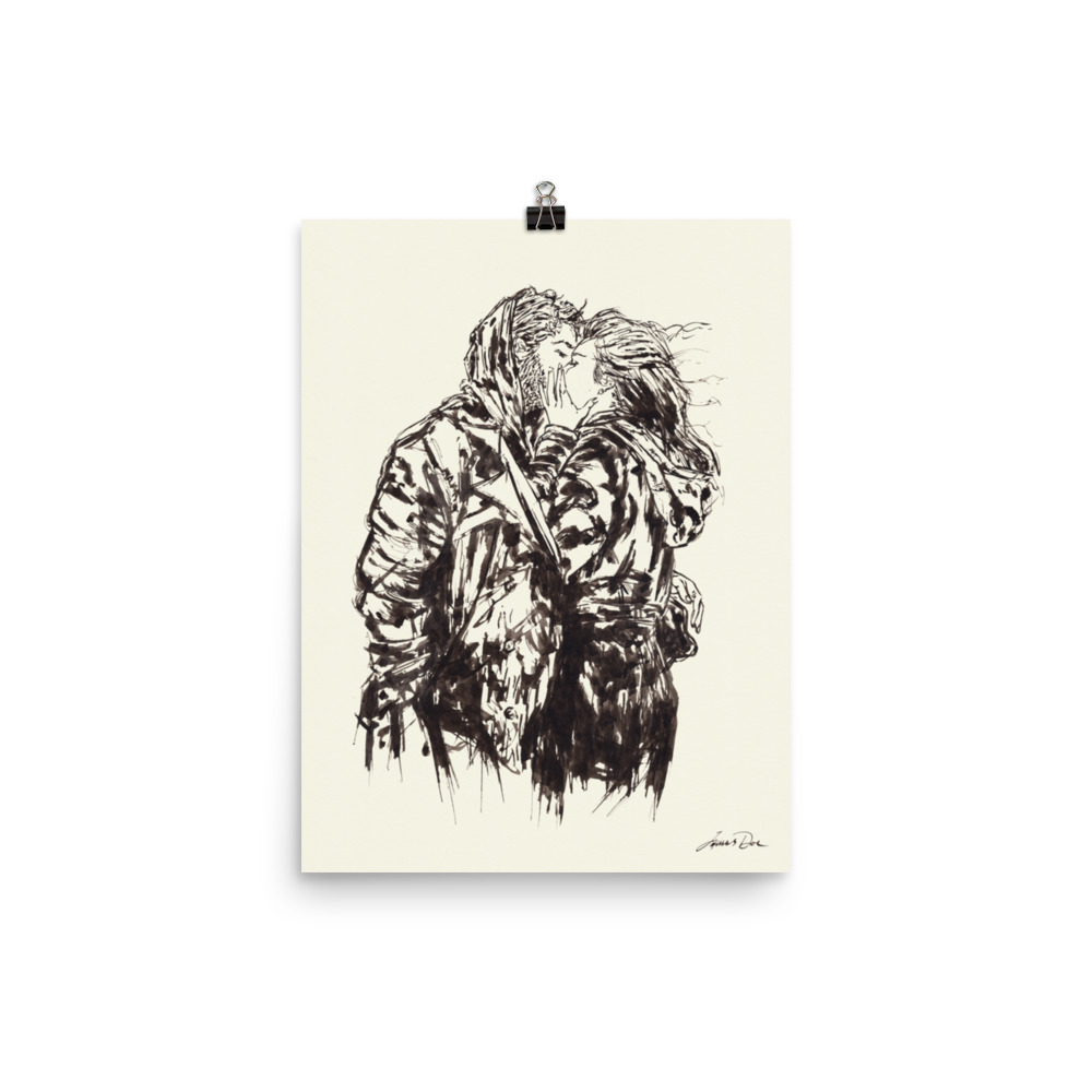 Art print of original ink artwork of a couple embracing. This piece was sketched during an after-work coffee-drinking session.