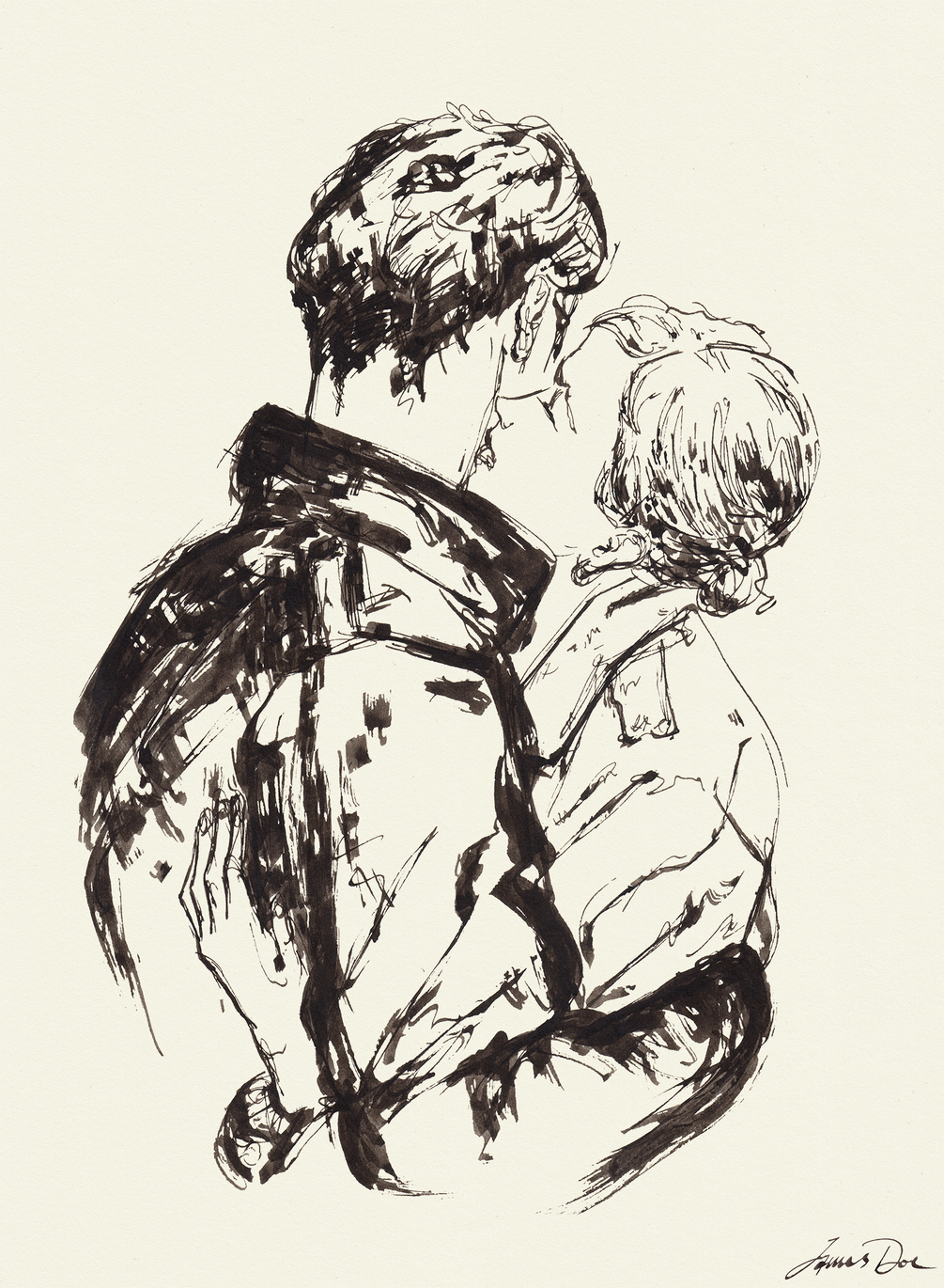 Art print of original ink artwork of a couple embracing. This piece was sketched during an after-work coffee-drinking session.