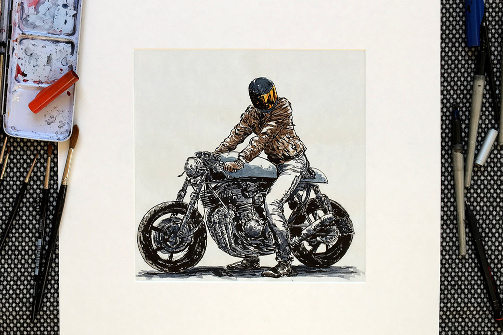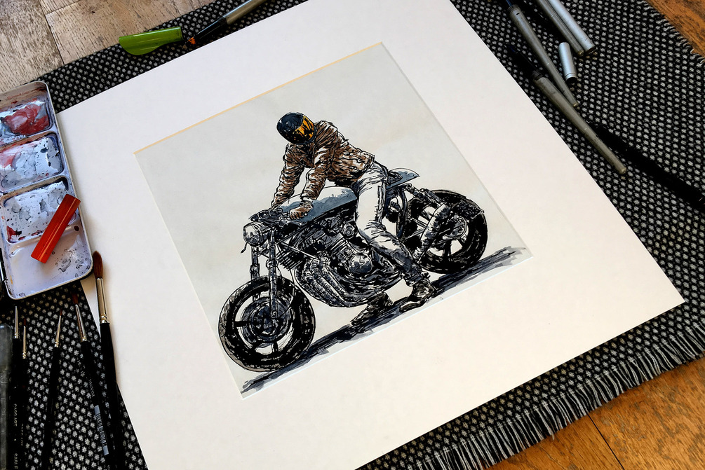 Original ink and watercolour artwork of a custom Honda 1995 Seven Fifty CB750 with CB550 tank.